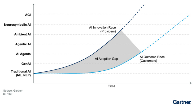Industry research consistently highlights the growing gap between the speed of AI capability development and organisational readiness to adopt it effectively. According to Gartner, the mass proliferation of AI providers launching agentic models, agentic-integrated platforms and other agent-infused products far exceeds the present demand.