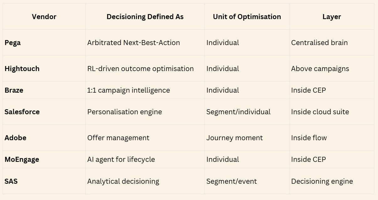 That makes Aampe’s definition the most radical here: decisioning as a continuous, causal, per-user process - without campaign boundaries, without functional silos, organised around the human rather than the business objective. No other vendor in my view fully satisfies that definition.