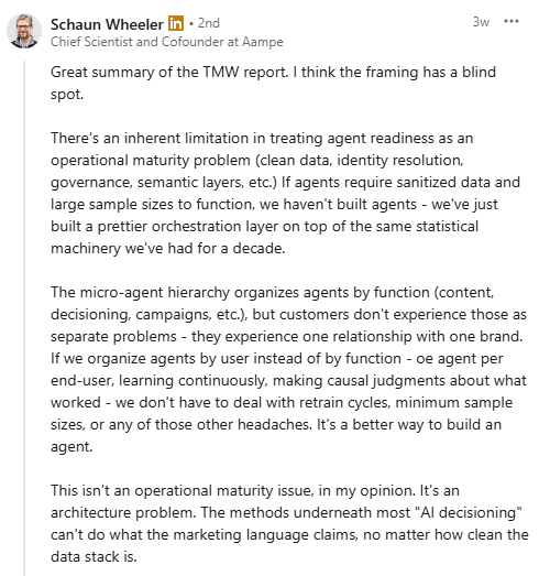 Aampe’s co-founder has argued that the problem is architectural, not operational: “The methods underneath most ‘AI decisioning’ can’t do what the marketing language claims, no matter how clean the data stack is.” Organising agents by function - content, decisioning, campaigns - recreates fragmentation at the architecture level. Customers experience one brand, not separate functions. The only coherent unit of organisation, in Aampe’s view, is the individual user.